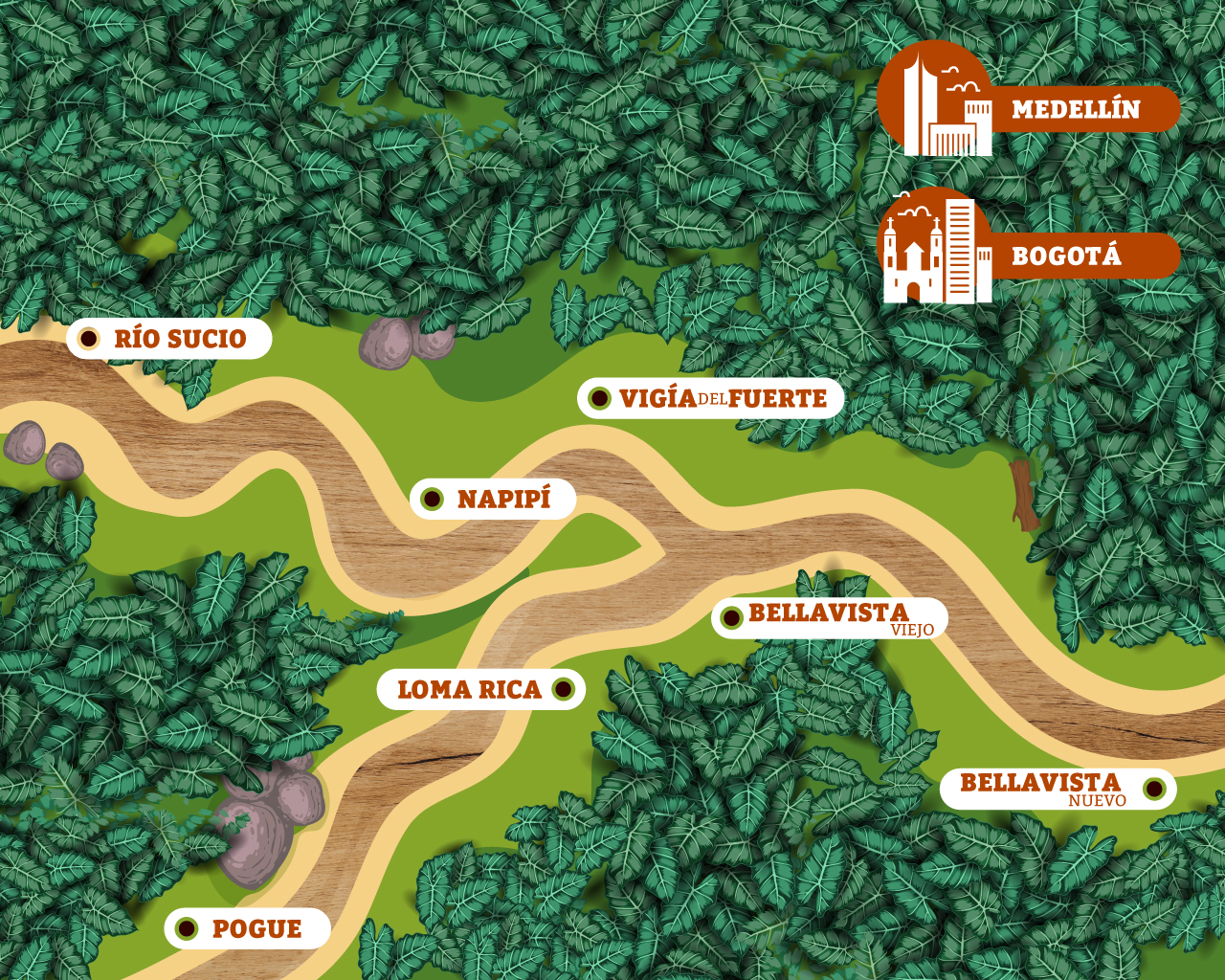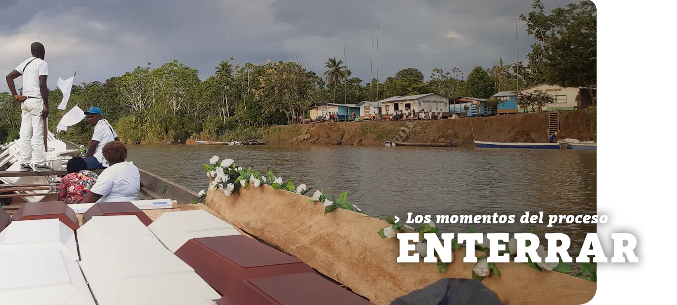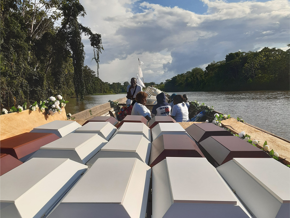 En una caravana de botes acondicionados para transportar los 102 cajones con los cuerpos de los familiares asesinados, la comunidad emprende el recibimiento de sus seres queridos tras estar más de dos años en laboratorios del Instituto Nacional de Medicina Legal y Ciencias Forenses en Medellín e Itagüí. Entre el 11 y el 30 de noviembre de 2019, después de 17 años de sufrir uno de los crímenes más atroces del conflicto armado colombiano, las familias y comunidades afros e indígenas de Bojayá, reciben, nombran, velan, recorren, entierran y acompañan durante día y noche los cuerpos de sus seres queridos asesinados y masacrados entre abril y mayo de 2002.