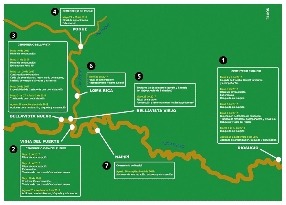 La materialización de los procedimientos de exhumación, identificación, individualización, entrega y entierro final que tienen lugar entre el 2017 y el 2019 es resultado de este largo recorrido que las comunidades afros e indígenas de Bojayá y del Medio Atrato chocoano hemos emprendido para reclamar y garantizar nuestros derechos a la verdad, al duelo, al ritual y al entierro digno de nuestros seres queridos, y contra la impunidad que permanece frente a las violaciones y atrocidades cometidas en el territorio.