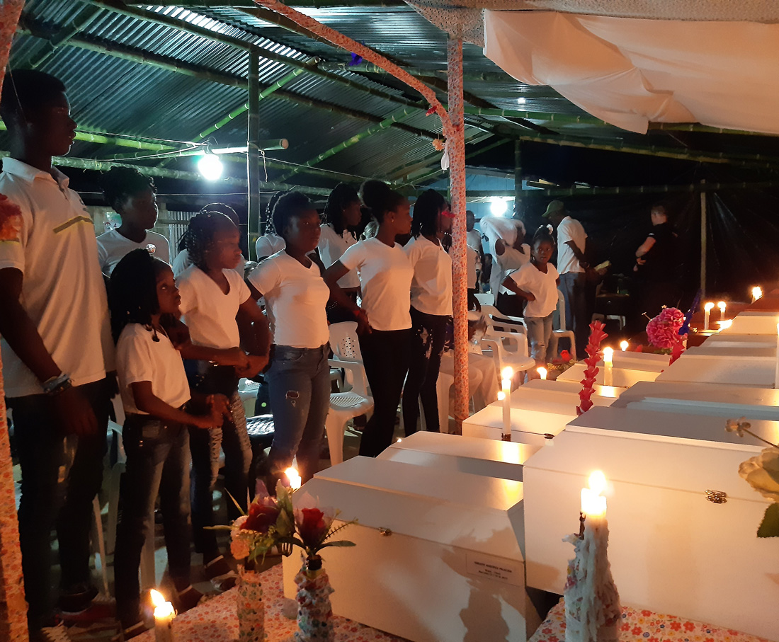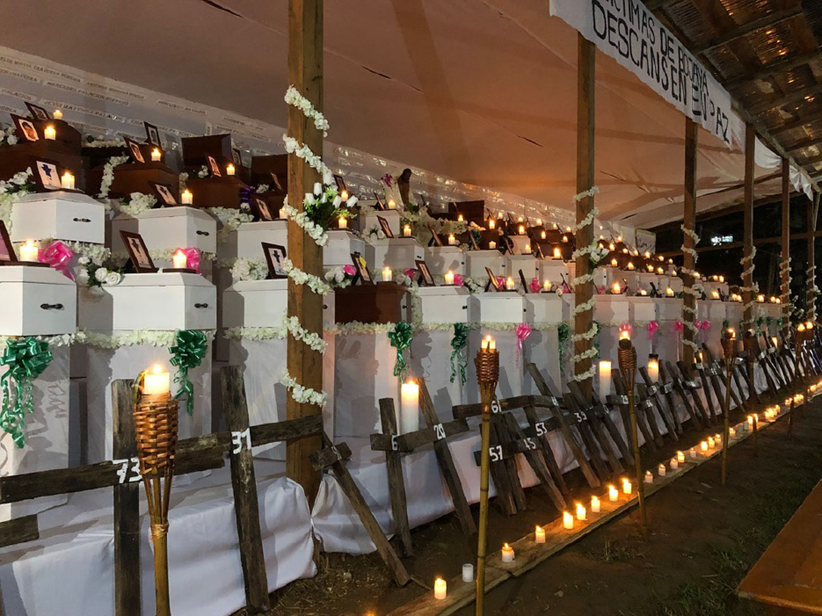 Altares con los 102 cajones de las víctimas de la masacre de Bojayá, durante rituales de entrega y velorio. Noviembre 2019. Fotos: Pilar Riaño y Natalia Quiceno.