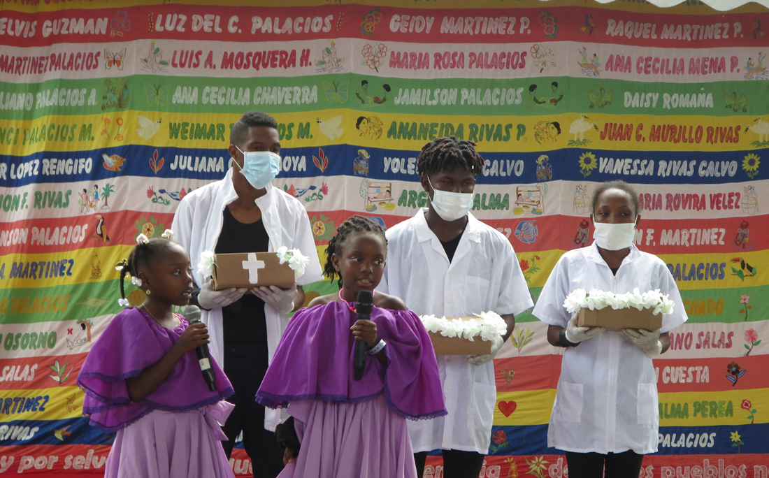 Imagen de la presentación de la obra de teatro Honrar los sagrados espíritus a cargo del grupo de teatro de jóvenes de Bellavista durante el evento público desarrollado en el marco de la entrega individualizada y entierro final. Bellavista. Noviembre 17, 2019. Foto: Natalia Quiceno.