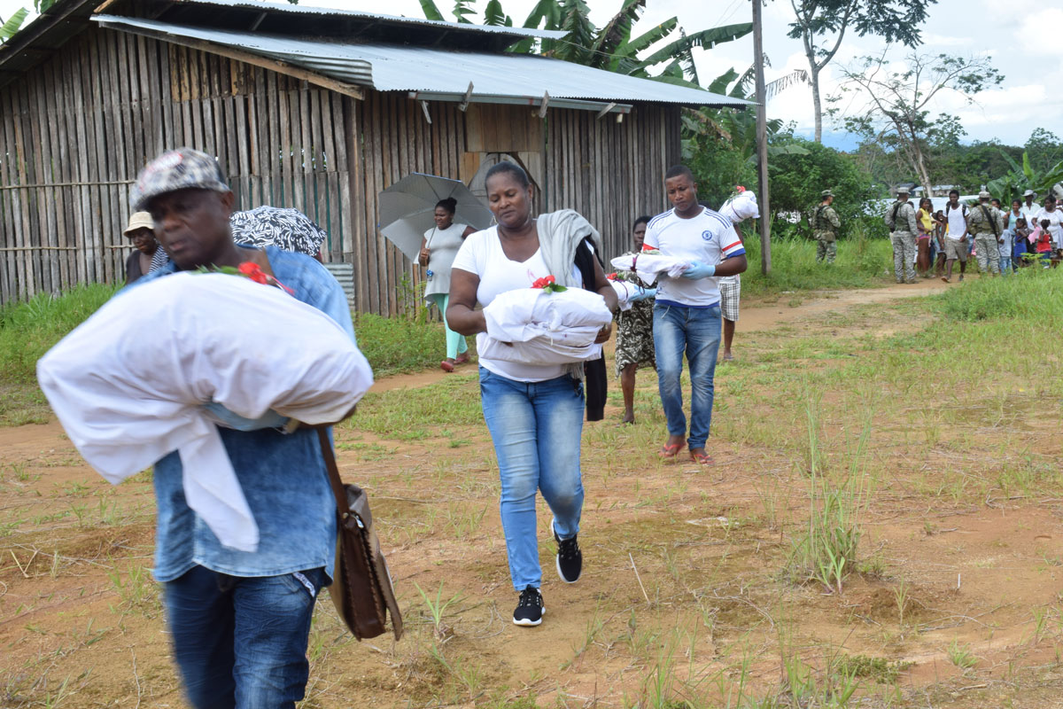Familiares llevan en procesión los cuerpos de sus familiares hacia el helicóptero que los llevará a Medellín. Mayo, 2017, Bellavista Nuevo. Foto: Comité.
