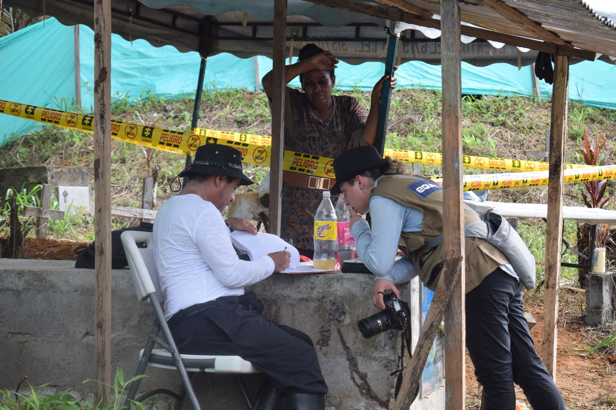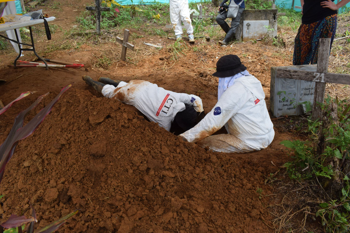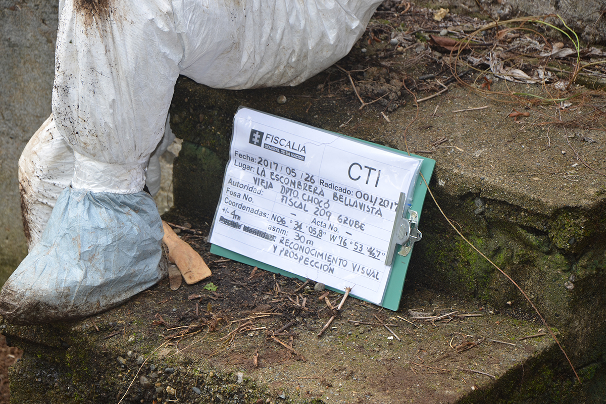 Una vez finalizan los rituales, el equipo de antropólogos/as, topógrafo, fotógrafo y técnicos de la Fiscalía General de la Nación inicia las labores de ubicación de las fosas, remoción de materiales y excavación. Su labor, acompañada por un equipo local de sepultureros y ayudantes locales, en términos generales, consiste en «una excavación controlada por niveles hasta hallar la primera evidencia del cadáver». A partir de allí, se hace uso de herramientas pequeñas para descubrirlo completamente y llamar a las familias para que observen qué se ha encontrado.