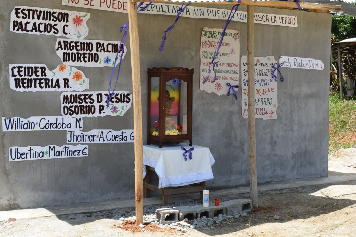 En las imágenes se aprecian a niños, niñas y personas adultas con letreros de los nombres de las víctimas y al lado de las bóvedas temporales durante los rituales de acompañamiento, rezo y canto para las personas exhumadas que se realizan al final del día. Al fondo el telón «Nuestras víctimas, 2 de mayo 2002, Bellavista, Bojayá, Chocó» y el Cristo Mutilado. Fotos: Comité.